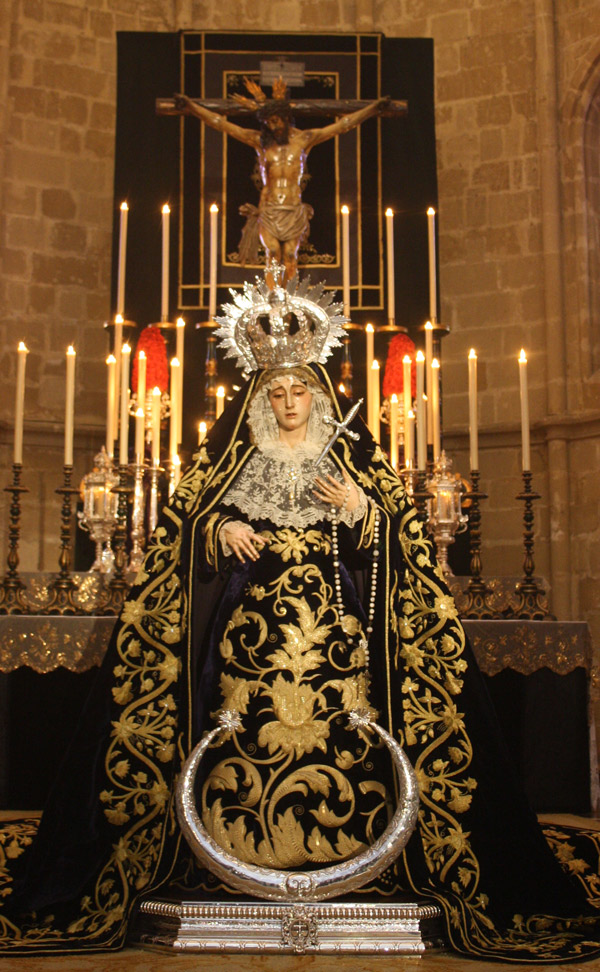 Dolorosa bajo palio de corte clásico de cajón, bajo la advocación de Las Lágrimas.