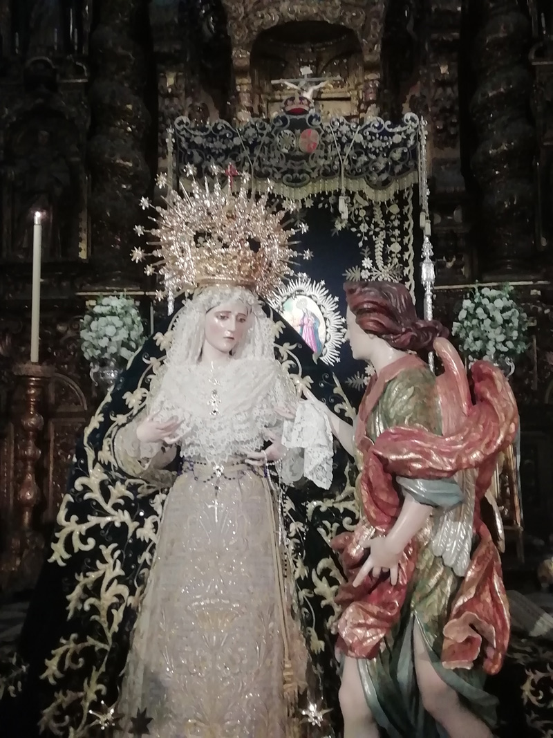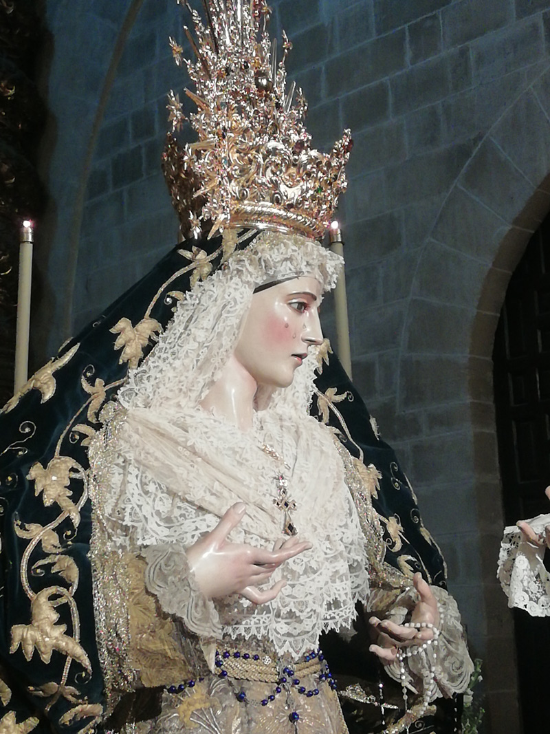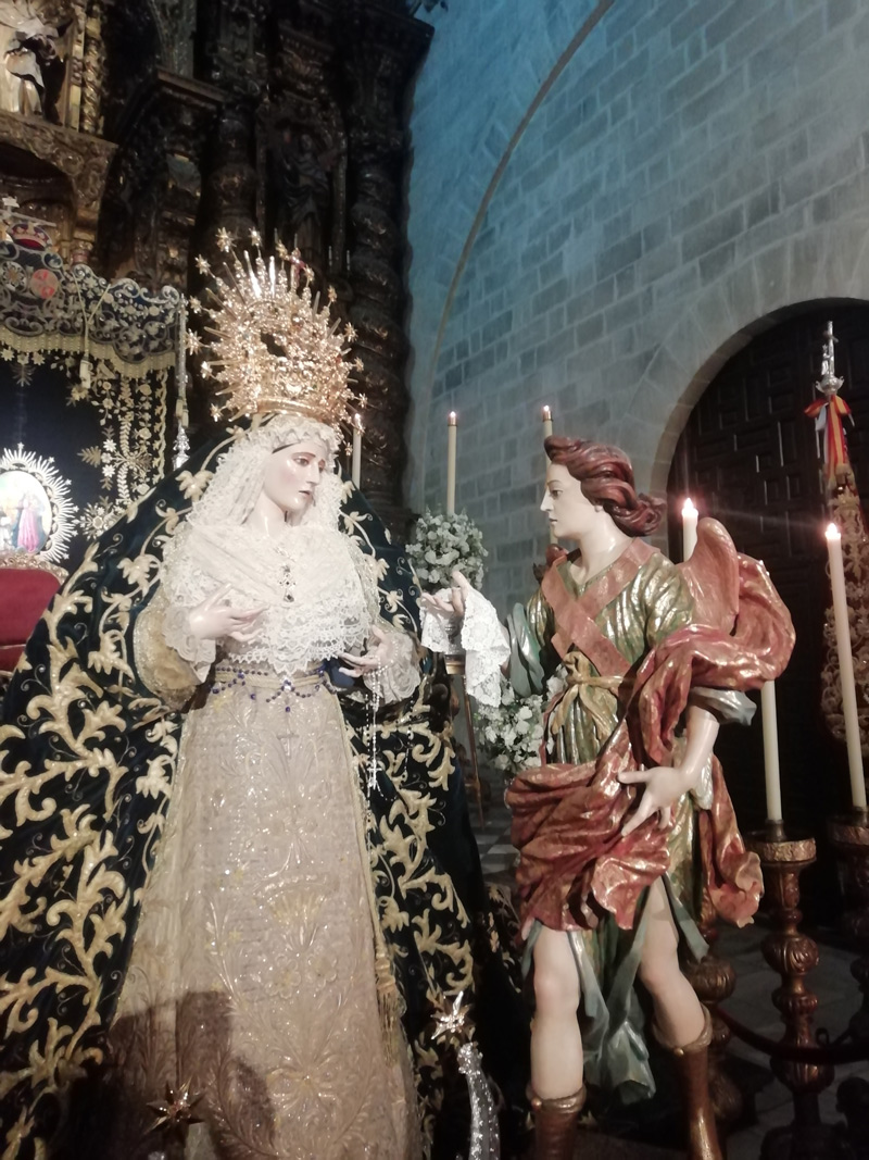 María Santísima de la Confortación, obra anónima del siglo XVII atribuida a Jacinto Pimentel. Procesiona junto a ella, el Ángel Confortador, obra atribuida a La Roldana.